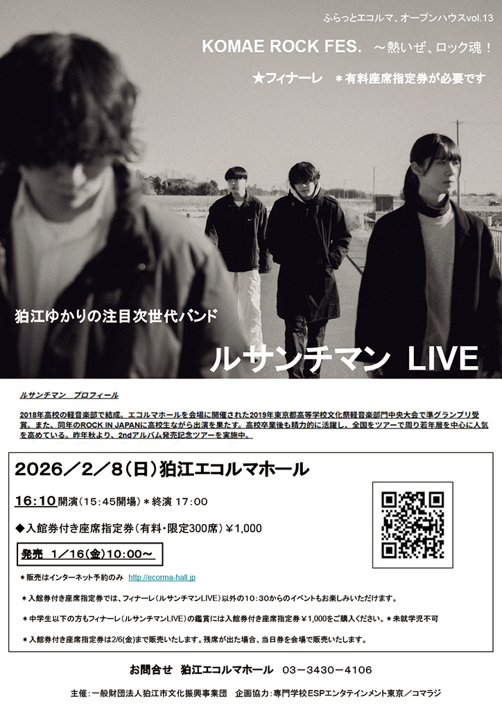 2/8(日)ふらっとエコルマ、オープンハウスvol.13 KOMAE ROCK FES. フィナーレ・ルサンチマンLIVE(16:10~)の入館券付き座席指定券は、 本日16日10:00より販売です。*インターネット予約のみ